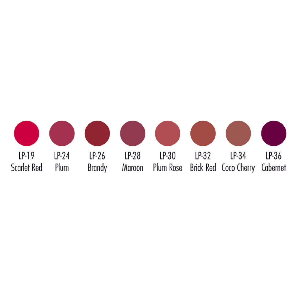 Decadently creamy pencils line, shape or fill lips with ease and saturated color. Ben Nye's Ultra-creamy formula combines high pigmentation for long lasting beauty. Our shades are perfect for any look in naturals, pop colors and exceptional reds. Shape and define, or wear alone with gloss. LP-19 : Scarlett LP-28 Maroon LP-30: Plum Rose LP-36 Cabernet LP-32 Brick Red LP-34 Coco Cherry