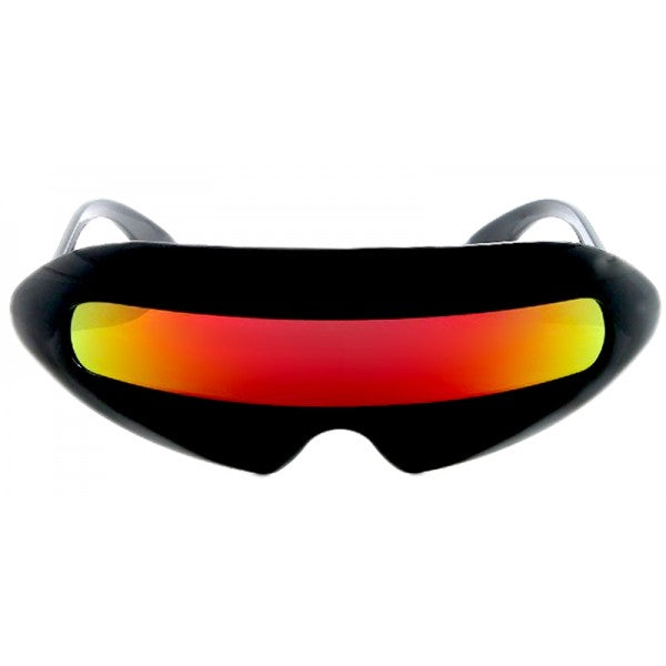 This is a pair of black futuristic glasses with a single wide lens. The lens is red with yellow highlights.