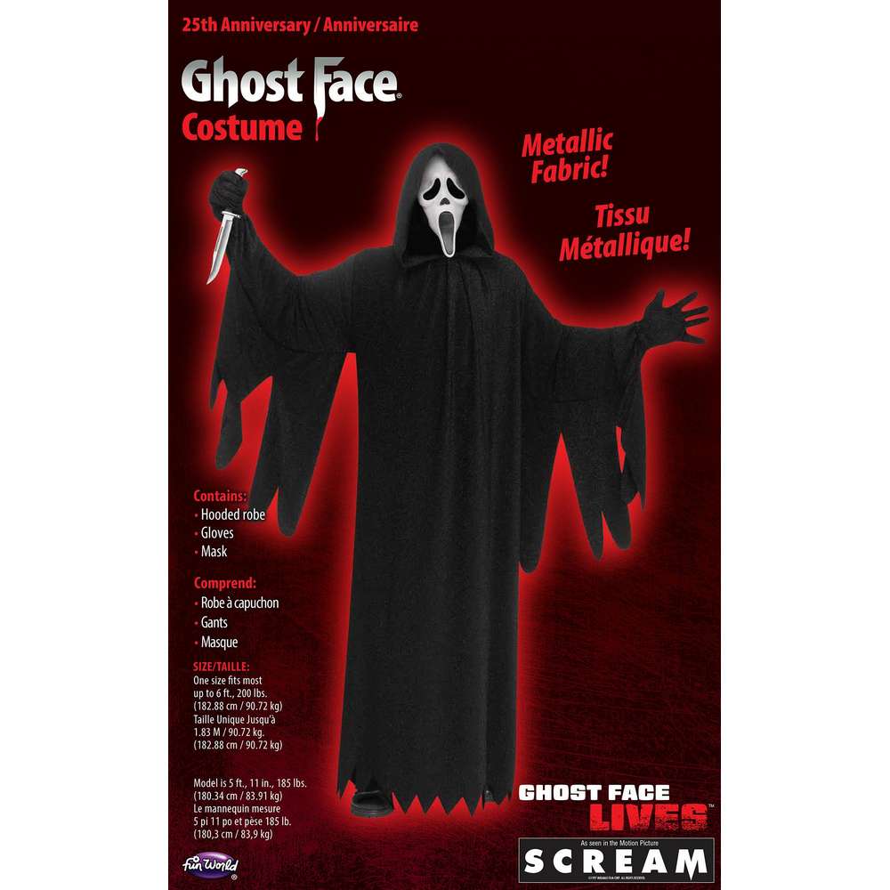 This scary Ghost Face 25th Anniversary costume for adults includes a deluxe hooded robe with silver metallic accents, gloves and mask. Halloween costume for men (or women) licensed by Scream, the classic horror film.