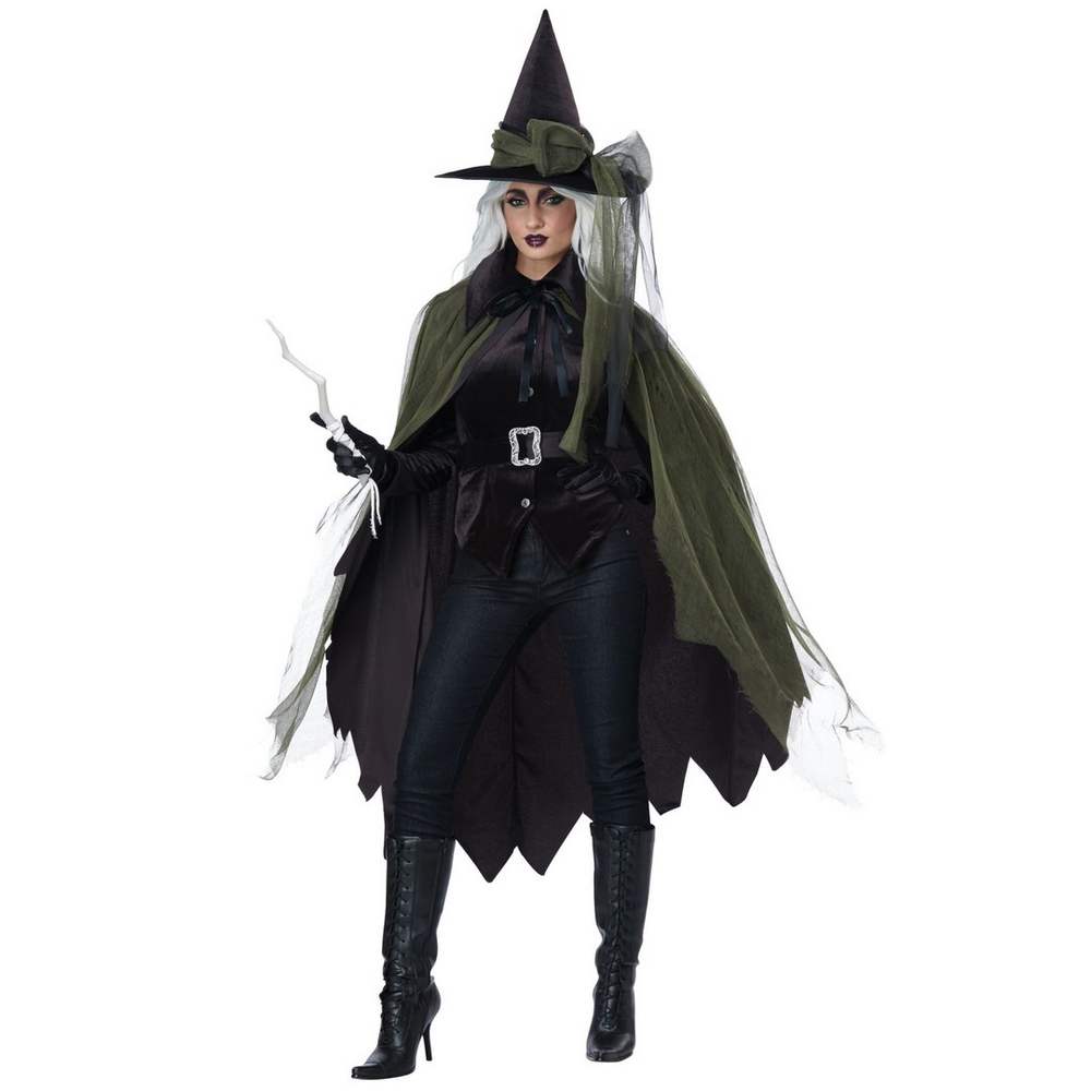 The Gothic Witch women costume includes a button down jacket, a long skirt, a green and black layered over skirt which can also be worn as a cape, a belt with decorative buckle, two hat ties and a two piece easy to assemble witch hat.