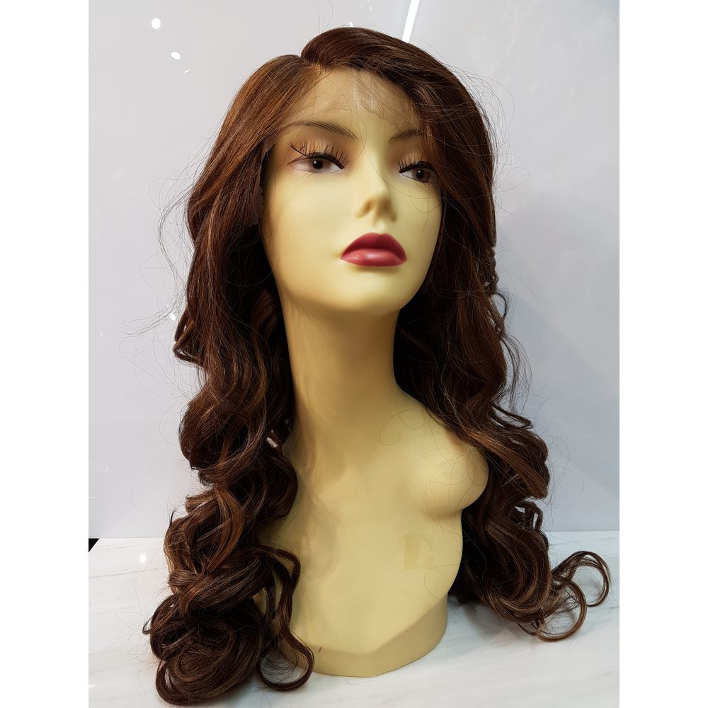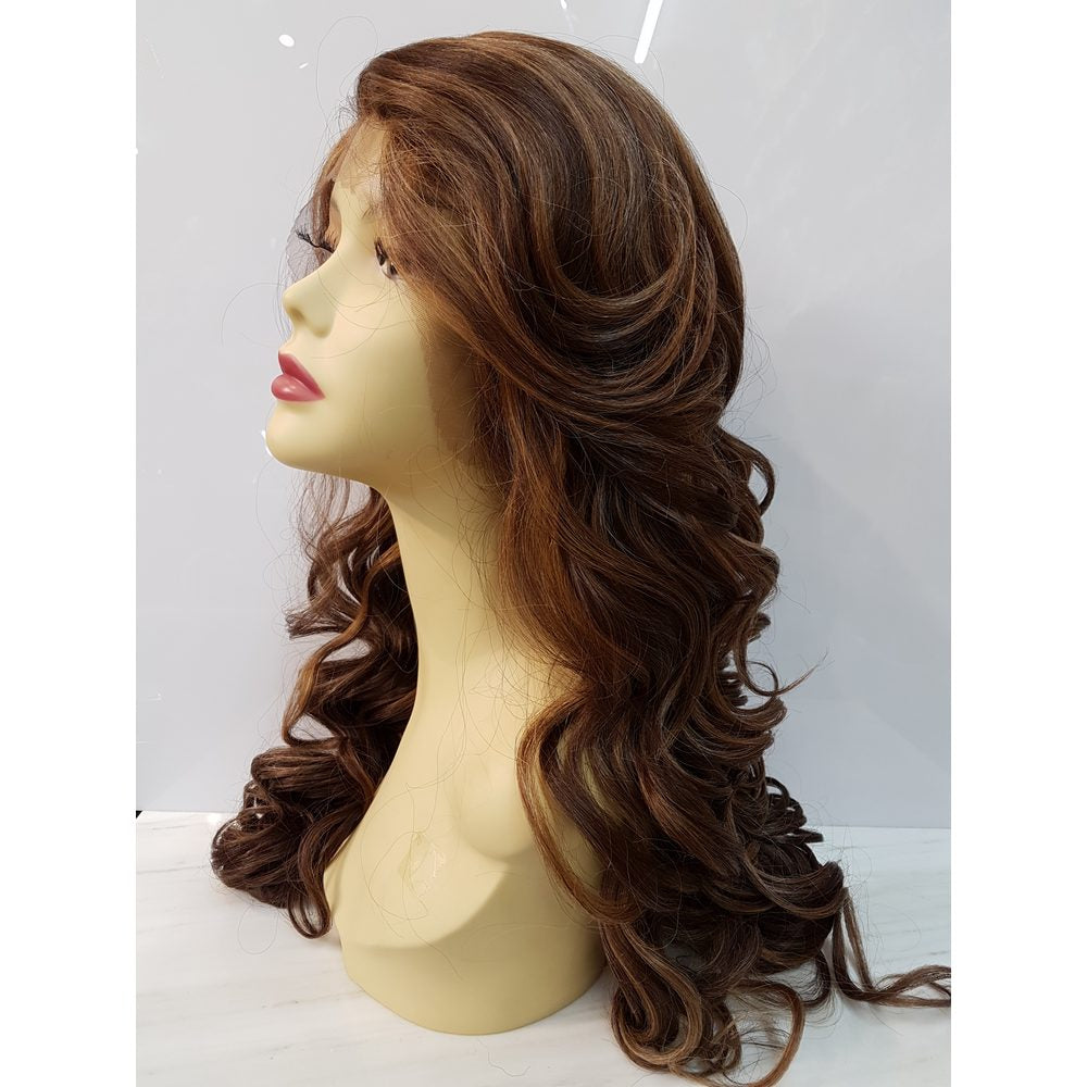 Lace front 100% high heat resistant (up to 340 degrees) fiber lace front wig, long curly style. Hand tied lace patch.