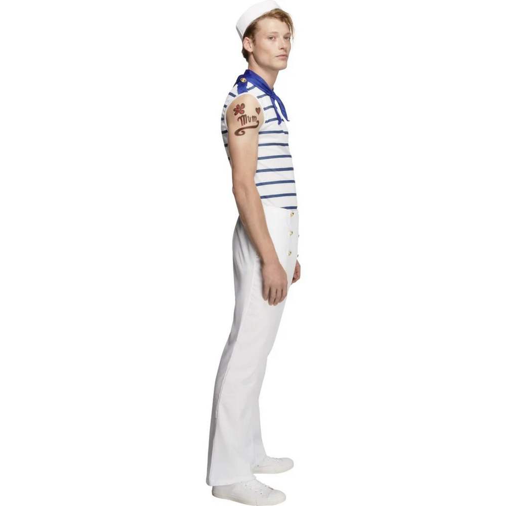 Fever Male French Sailor adult Costume, with sleeveless Top, Trousers and Neck Scarf. White and blue Men disguise.
