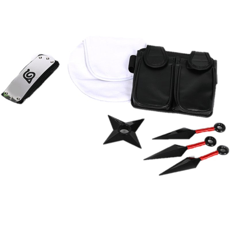 Ninja cosplay set accessories. Includes: Head band, 2 pouches, a shuriken and three kunais (13cm/5")