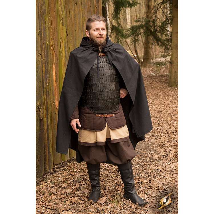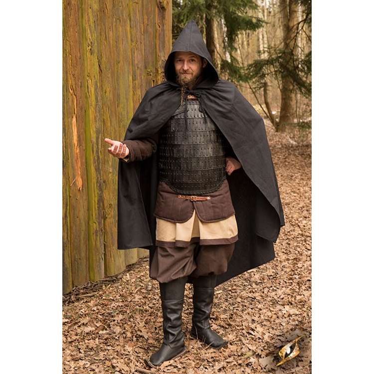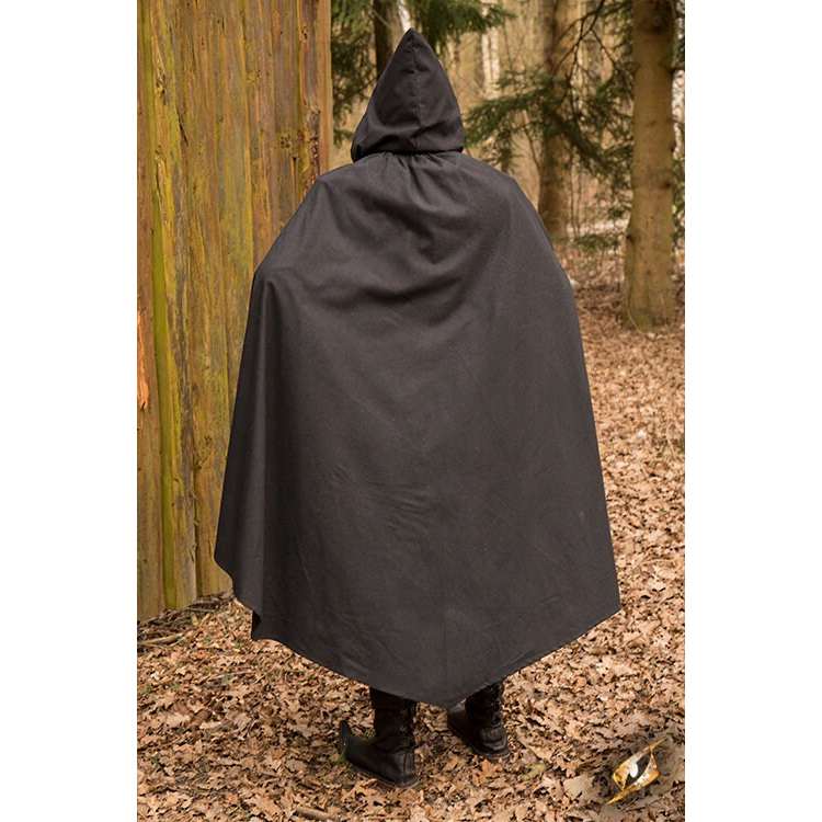 This Ready-for-Battle Cape is an advanced semi-circular cape: short at the flanks, long at the back, and fitted with a hood with cotton-strap fastenings. This design combines ease of movement with the best degree of protection from the elements. Made from durable cotton, this cape is easily made water resistant with a treatment at home.