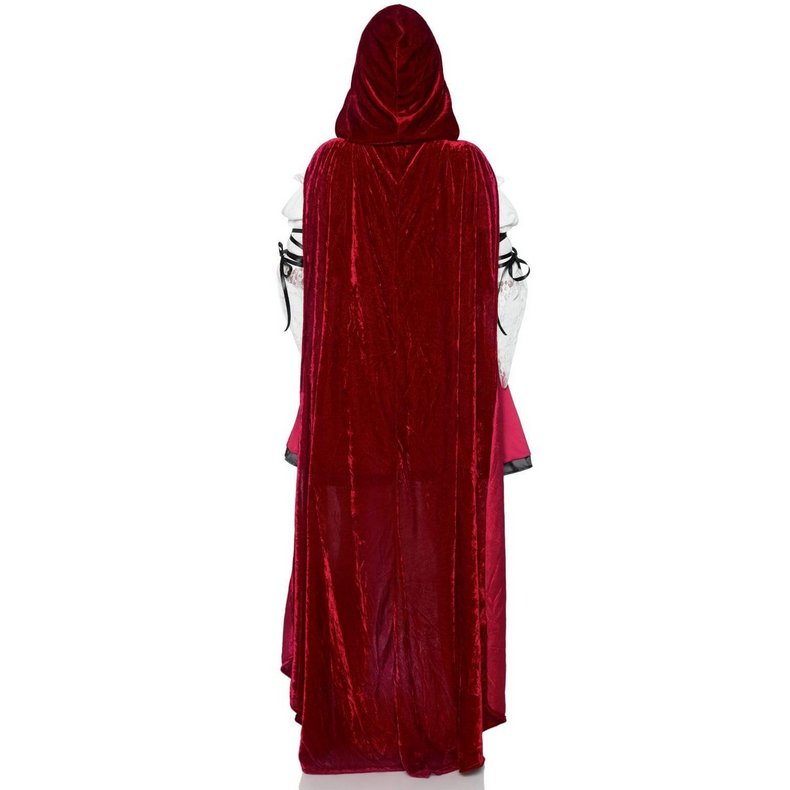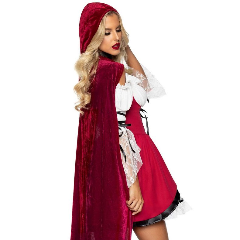 2Pc. Storybook Red Riding Hood women costume. This disguise includes Lace Trim Dress with Lace-Up Waist, Attached Long Hooded Cape & Choker.