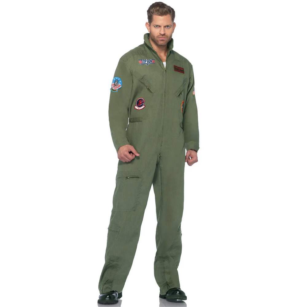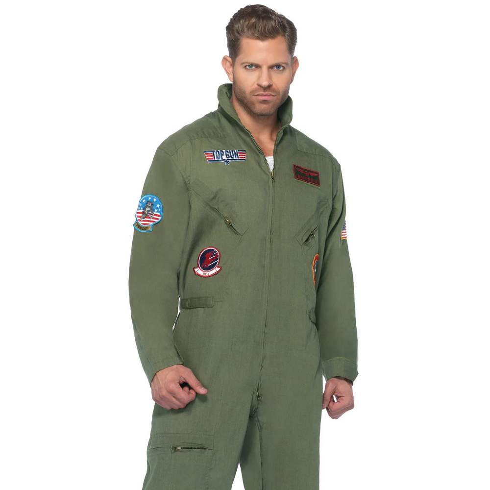 Top Gun Men's Flight costume Suit. This adult disguise includes: zipper front flight suit with zipper pocket details, movie patch accents, and interchangeable Maverick and Goose name badges.